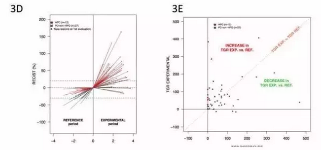 為了識別出癌癥疾病進(jìn)展了的群體,研究人員計(jì)算了滿足以下條件的患者數(shù):治療后的TGR> 治療前TGR x t,其中t是整數(shù)閾值(從1到5)。t為2,3,4,5的就是疾病高度進(jìn)展了的患者(HPD)。