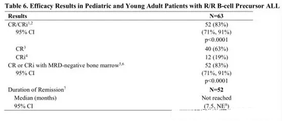 1 CR / CRi是根據(jù)所有接受KYMRIAH并完成至少3個月隨訪的患者計算的,或在數(shù)據(jù)截止前較早停藥。要求緩解狀態(tài)維持至少28天,無臨床證據(jù)復(fù)發(fā)。