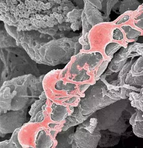 圖中灰色管狀為毛細血管,哪里有血管哪里就有間充質(zhì)干細胞(紅)。
