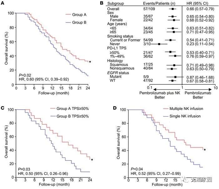 在PD-L1 ≥50%的患者中,A組患者的中位OS為17.0個(gè)月,比B組患者的中位OS更長(zhǎng)(圖C)。此外,接受多療程N(yùn)K細(xì)胞輸注的患者的中位OS明顯長(zhǎng)于僅接受單療程N(yùn)K細(xì)胞輸注的患者(圖D)