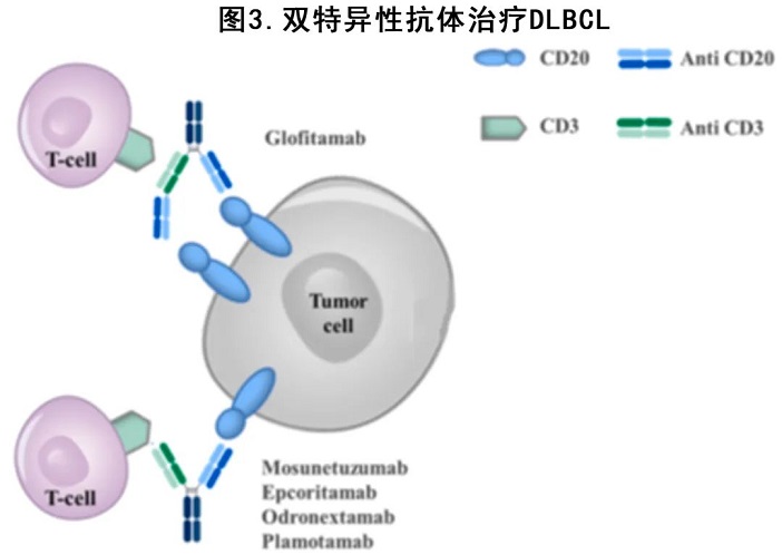 雙特異性抗體 (BsAb) 是識別兩種特異性抗原或表位的單抗,可使自體 T 細胞重定向?qū)鼓[瘤細胞(圖3)。最近已有多個不同抗 CD20 BsAbs 在R/R DLBCL 進行了研究,結(jié)果顯示即使在多難治性患者中也具有良好的活性,并且安全性可控,表現(xiàn)為CRS和神經(jīng)毒性事件的發(fā)生率較低,多為1-2級。
