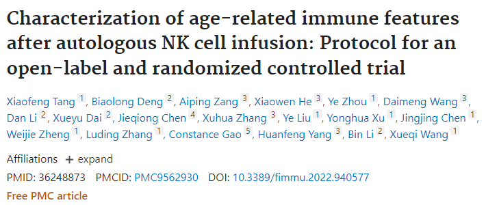 2022年9月,上海長征醫(yī)院輸血科、上海交通大學(xué)免疫學(xué)研究所等單位聯(lián)合在《Frontiers in Immunology》上發(fā)表了一篇名為“Characterization of age-related immune features after autologous NK cell infusion: Protocol for an open-label and randomized controlled trial”的研究結(jié)果表明,自體NK細(xì)胞能夠顯著改善T細(xì)胞衰老和耗竭。