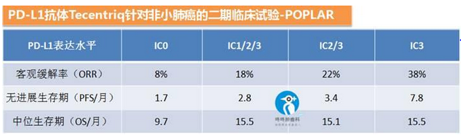 值得注意的是:這個(gè)臨床結(jié)果發(fā)現(xiàn)無(wú)論P(yáng)D-L1表達(dá)狀態(tài)如何,使用Tecentriq都會(huì)比使用多西他賽的患者OS更長(zhǎng)。之前就有Tecentriq針對(duì)非小肺癌的二期臨床POPLAR 研究,發(fā)現(xiàn)PD-L1表達(dá)量越高,Tecentriq的效果越好。IC0代表PD-L1陰性,IC1/2/3代表PD-L1陽(yáng)性,IC3是強(qiáng)陽(yáng)性。具體的臨床數(shù)據(jù)如下: