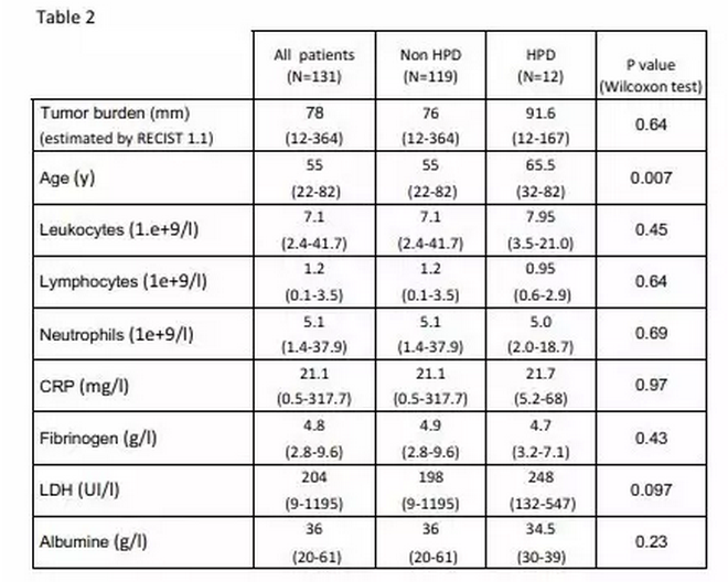 我們觀察到HPD相比非HPD患者年齡更高,這是非常值得重視的。這可能是老年患者與年輕患者有著不同的免疫學(xué)背景的原因,比如T細(xì)胞共刺激/共抑制蛋白表達(dá),以及更高的炎癥細(xì)胞因子的濃度。同時(shí),這與之前三個獨(dú)立報(bào)道的三期臨床實(shí)驗(yàn)中老年人從藥物中受益較少的結(jié)果是一致的,這其中的機(jī)制非常值得研究。
