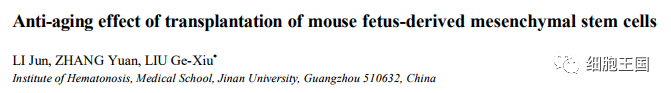 2010年暨南大學(xué)醫(yī)學(xué)院血液病研究所李軍研究小組,在間充質(zhì)干細(xì)胞抗衰老作用的動(dòng)物實(shí)驗(yàn)中發(fā)現(xiàn),干細(xì)胞移植組存活日期明顯長(zhǎng)于對(duì)照組,移植3個(gè)月后評(píng)價(jià)心功能的指標(biāo),心脾質(zhì)量指數(shù),器官組織學(xué)衰老程度評(píng)分結(jié)果以及血生化指標(biāo)皆優(yōu)于對(duì)照組,證實(shí)移植干細(xì)胞能有效地延緩衰老進(jìn)程。