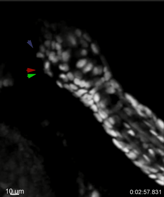 紅色圈內(nèi)是正在分裂的細胞,黃色箭頭標記的是逃走的干細胞,綠色箭頭標記的是正在凋亡的細胞。