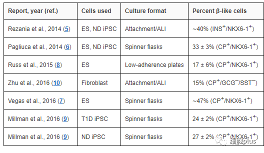 在實驗室將干細胞轉化為β細胞的過程是復雜的。在實驗室工作的科學家首先必須確定如何復制胰腺在人體中的發(fā)育方式,由于對人類胎兒發(fā)育的了解有限,干細胞生物學家進行了許多研究,以確定調控人類β細胞發(fā)育的特定基因。在過去的15年中,如下圖中的多個研究小組已經(jīng)獨立地利用這些研究從干細胞中成功地制造了β細胞,為基于干細胞的t1d治療創(chuàng)造了一條前進的道路。