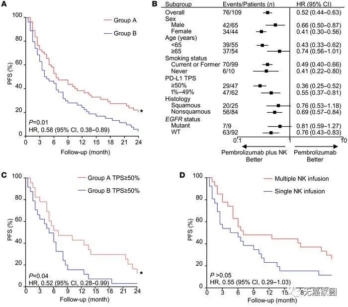 在PD-L1 ≥50%的患者中,A組患者的中位OS為17.0個(gè)月,比B組患者的中位OS更長(zhǎng)(圖C)。此外,接受多療程N(yùn)K細(xì)胞輸注的患者的中位OS明顯長(zhǎng)于僅接受單療程N(yùn)K細(xì)胞輸注的患者(圖D)