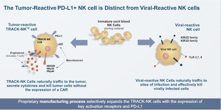 CYTO-102是一種由PD-L1陽性腫瘤反應(yīng)性NK細(xì)胞(TRACK-NK?) 組成的通用型細(xì)胞療法,通過對(duì)NK細(xì)胞進(jìn)行基因修飾以分泌高水平的可溶性IL-15。IL-15是一種免疫信號(hào)分子,在患者自身免疫系統(tǒng)的最佳抗腫瘤反應(yīng)中十分重要。在CYTO-102的制造過程中,IL-12、IL-18及其他信號(hào)分子可以誘導(dǎo)工程化NK細(xì)胞表達(dá)PD-L1,PD-L1陽性TRACK-NK細(xì)胞可以自然定向到腫瘤微環(huán)境殺死癌細(xì)胞,并調(diào)節(jié)患者自身免疫系統(tǒng)的適應(yīng)性或T細(xì)胞反應(yīng)。