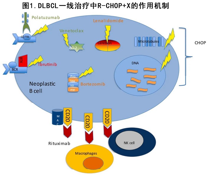 另一個不同且有吸引力的策略是在標準R-CHOP中加入新型生物藥物 (‘X’),無論是在誘導(dǎo)期還是作為維持期 (圖1)。