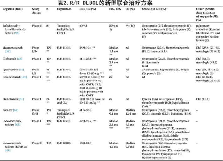除 CAR-T 外,其他有前景的藥物也正在成為 R/R DLBCL 的治療選擇(表2)。