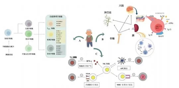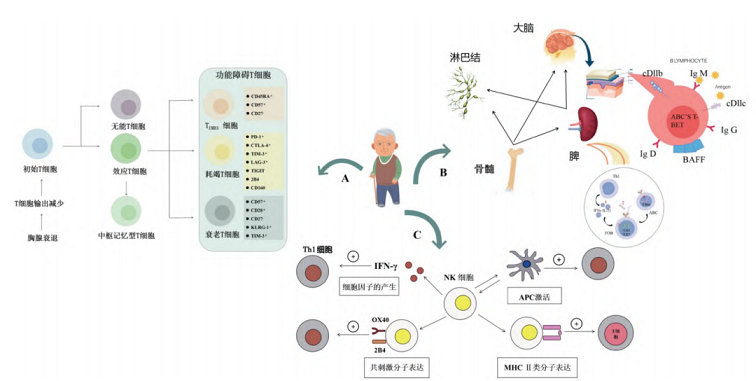 隨著年齡的增長,免疫系統(tǒng)也會發(fā)生衰老,即免疫衰老,免疫衰老是人體衰老過程或現(xiàn)象在免疫系統(tǒng)中的體現(xiàn)。在整個生命過程中,機體衰老和免疫功能的狀態(tài)呈現(xiàn)平行關系,即在機體衰老的過程中,免疫功能也會下降[2]。